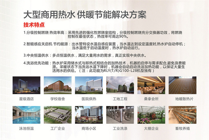 4.洗浴优先功能:热水炉采用储水式与即热式相结合的加热技术,机器的启停与需求配合,避免浪费能源。采暖状态下当洗浴水温下降时,机器会自动启动洗浴加热功能,以保证大量生活用水的供给。(注:此功能为RLY(T/R)G100-L28机型独有)